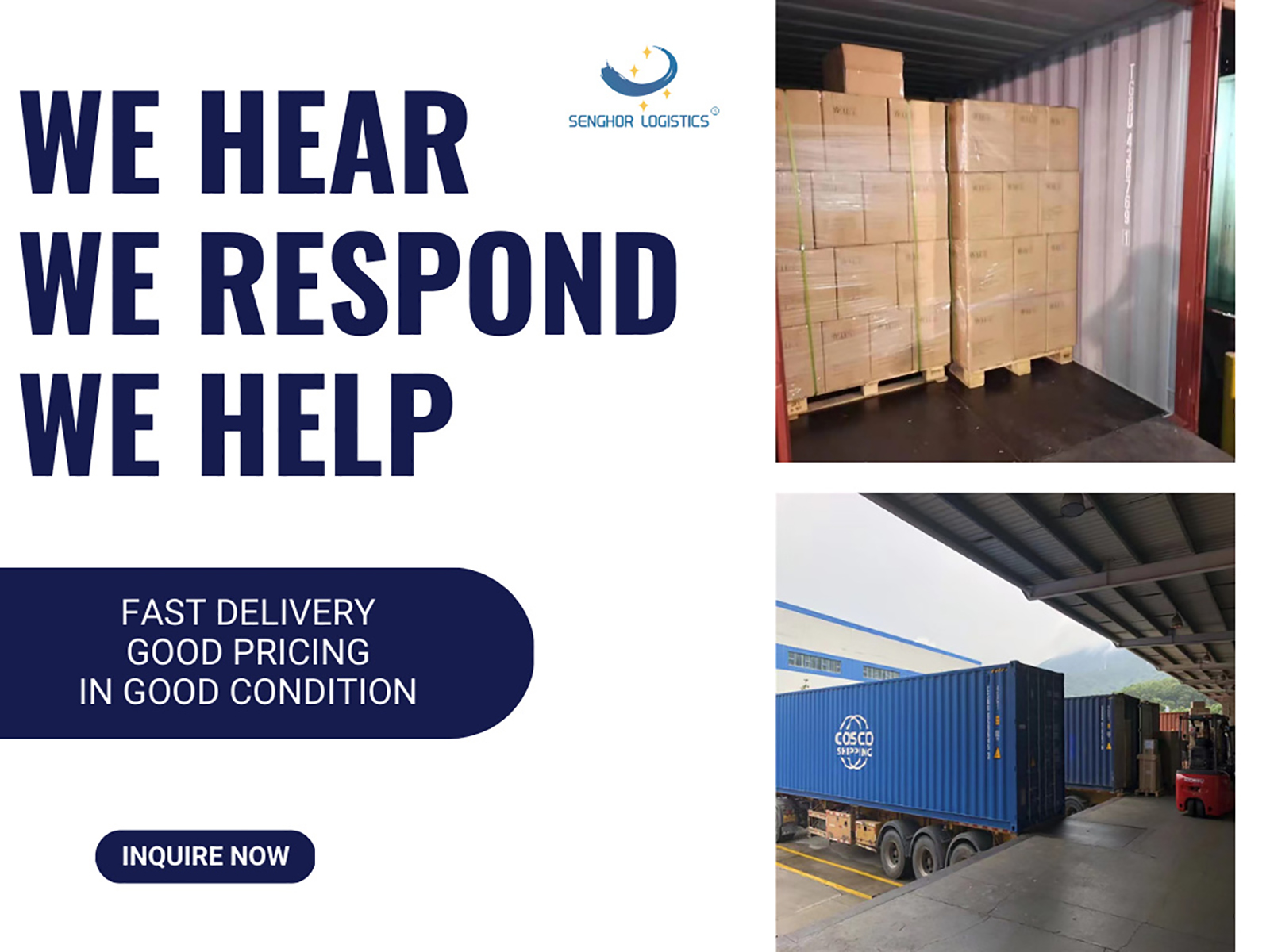 Senghor Logistics has established long-term partnerships with major shipping lines (such as COSCO, MSC, Maersk, and CMA CGM), ensuring priority access to vessel space and first-hand highly competitive freight rates. This means you benefit from reliable sailing schedules and cost savings, which we pass on to you. We offer diversified transportation solutions and competitive logistics freight rates, which can help customers save 3% to 5% of logistics freight annually.
